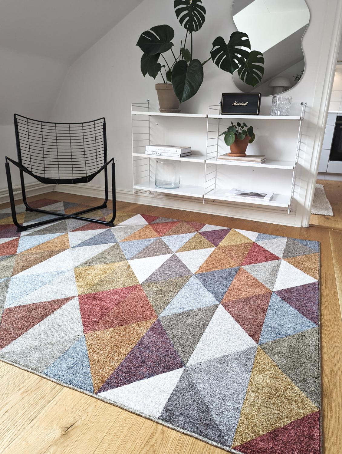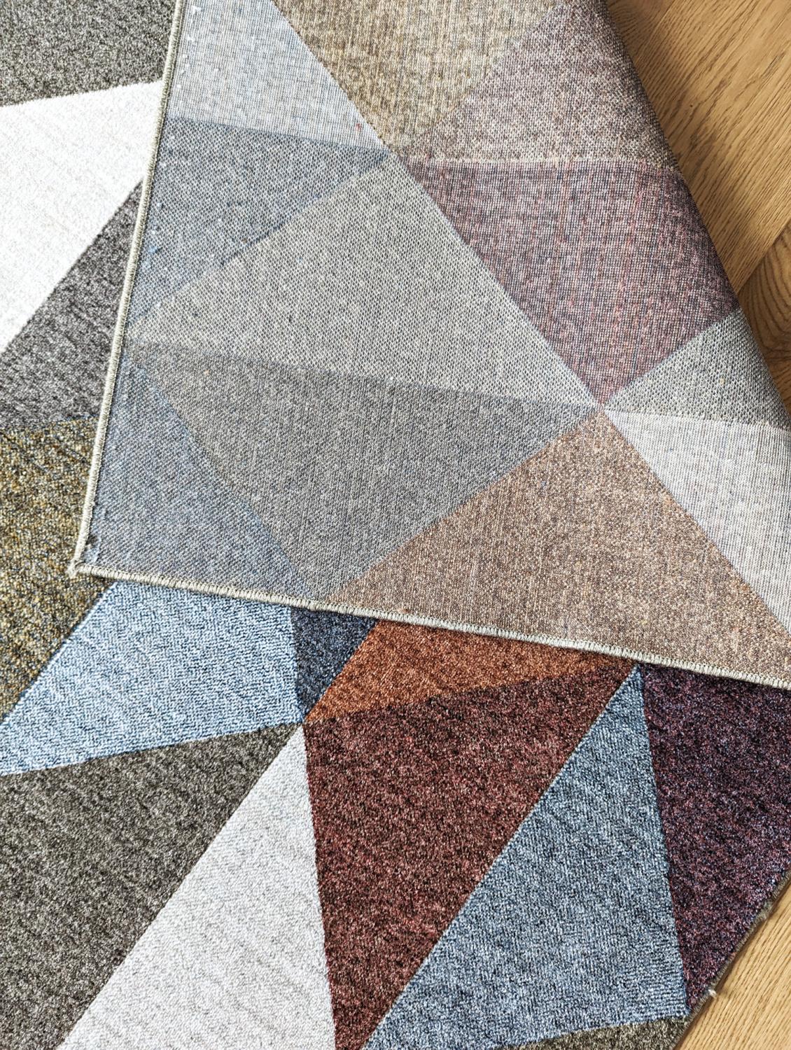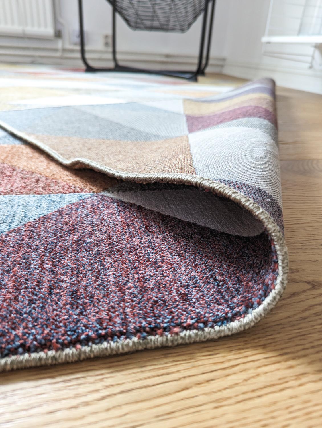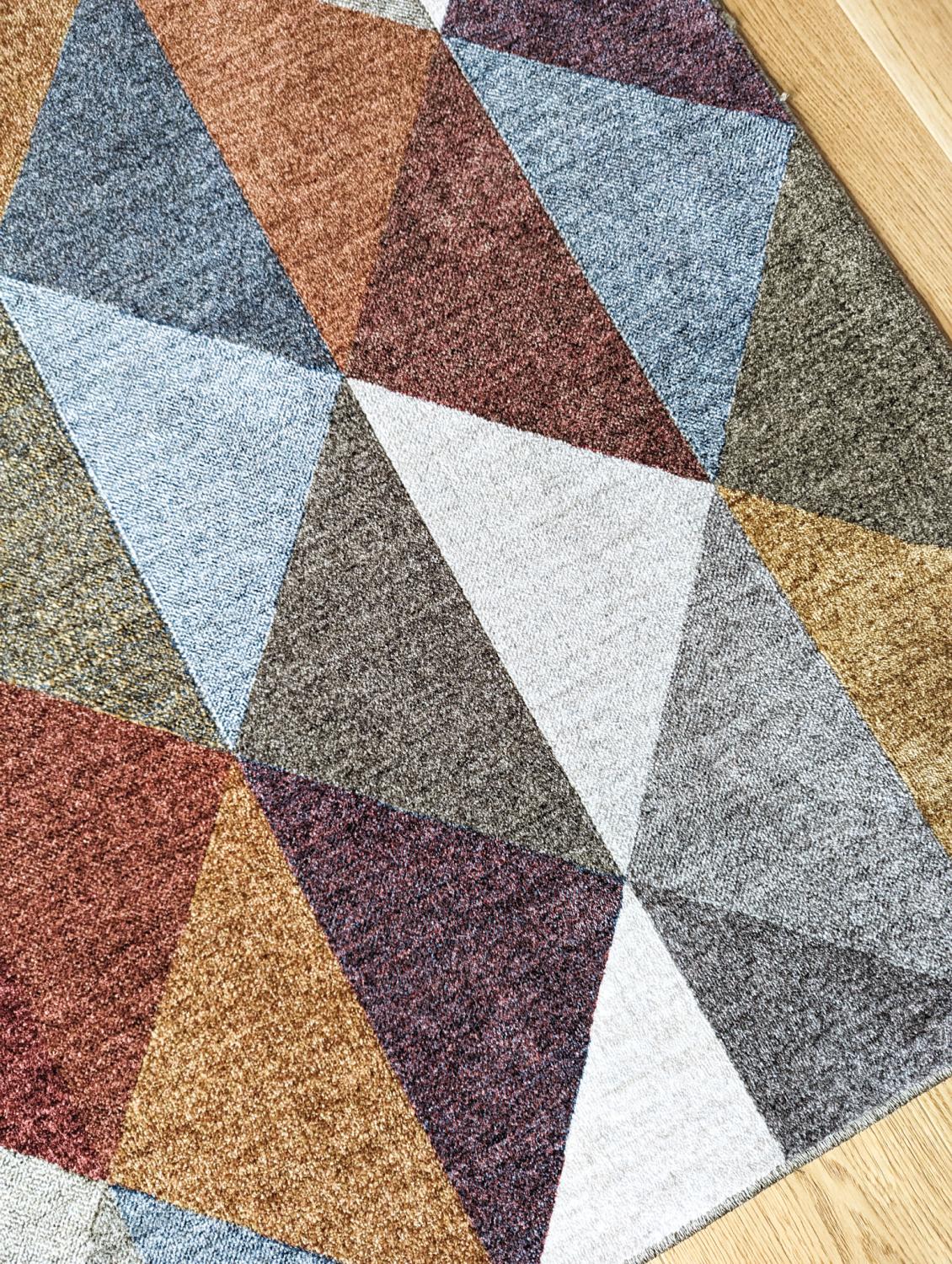 Carlo Triangle är en matta med en fantastik färgpalett. Varje garn är melerat vilket gör att denna mattan har ett otroligt djup i sina färger. Varje triangel i mattan har sen egna basfärg som sedan har blandats upp med flera andra färger. Titta noga på de fina melerade skiftningarna i mattan.