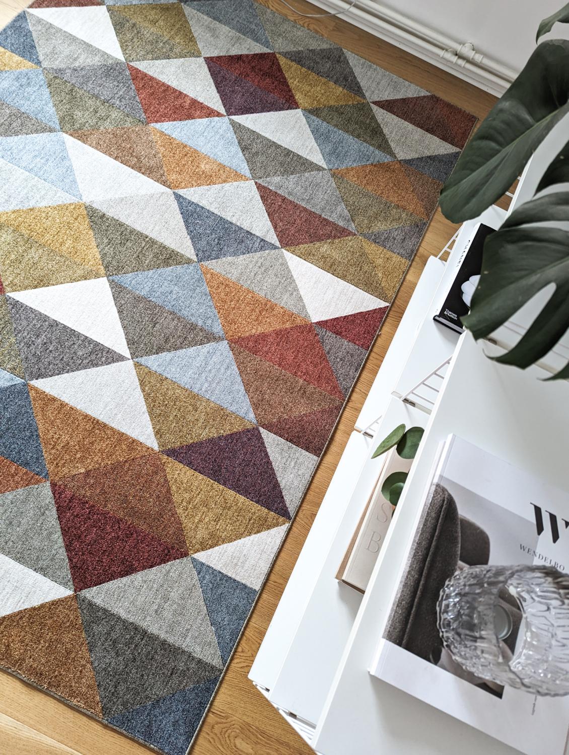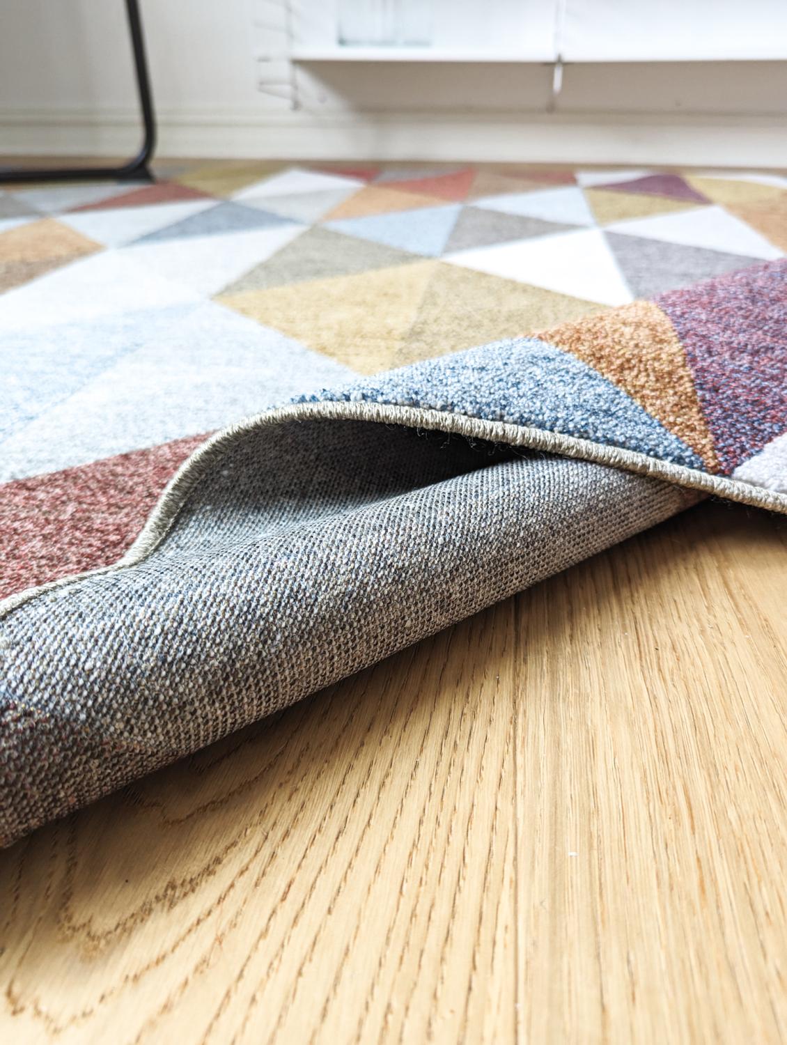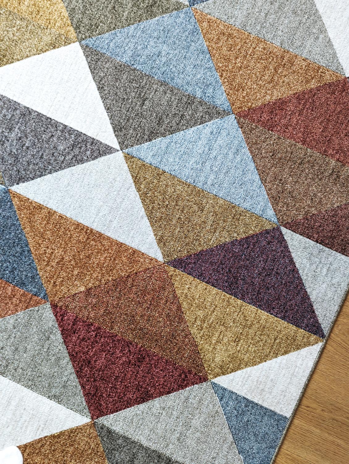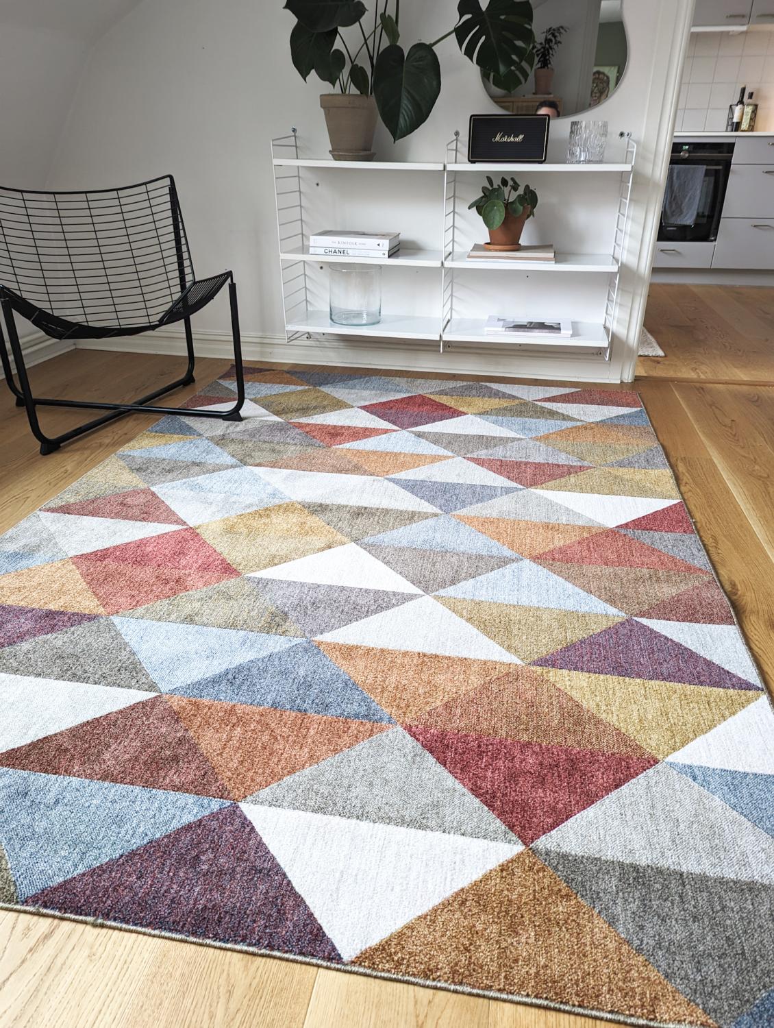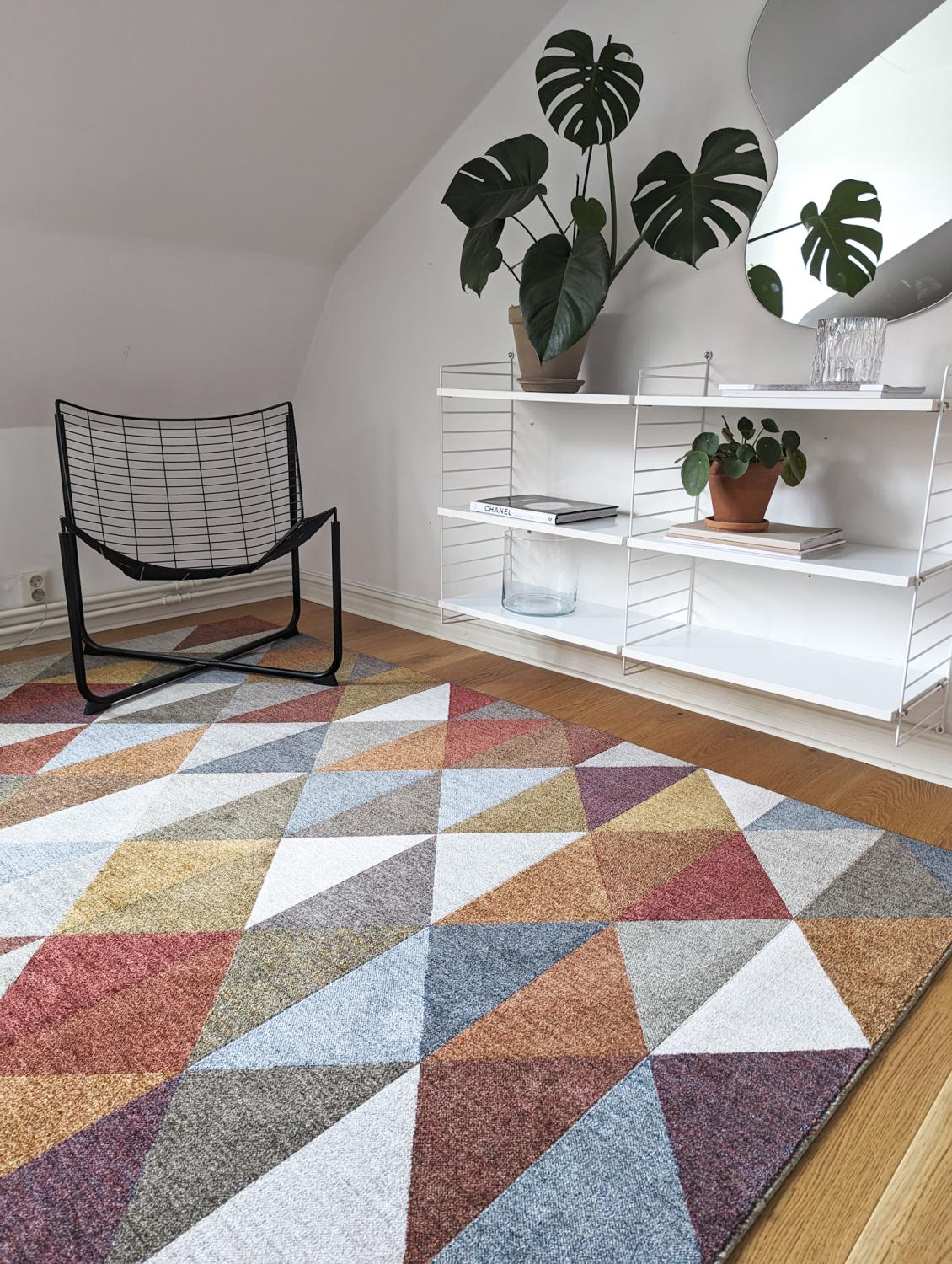 Carlo Triangle är en matta med en fantastik färgpalett. Varje garn är melerat vilket gör att denna mattan har ett otroligt djup i sina färger. Varje triangel i mattan har sen egna basfärg som sedan har blandats upp med flera andra färger. Titta noga på de fina melerade skiftningarna i mattan.
