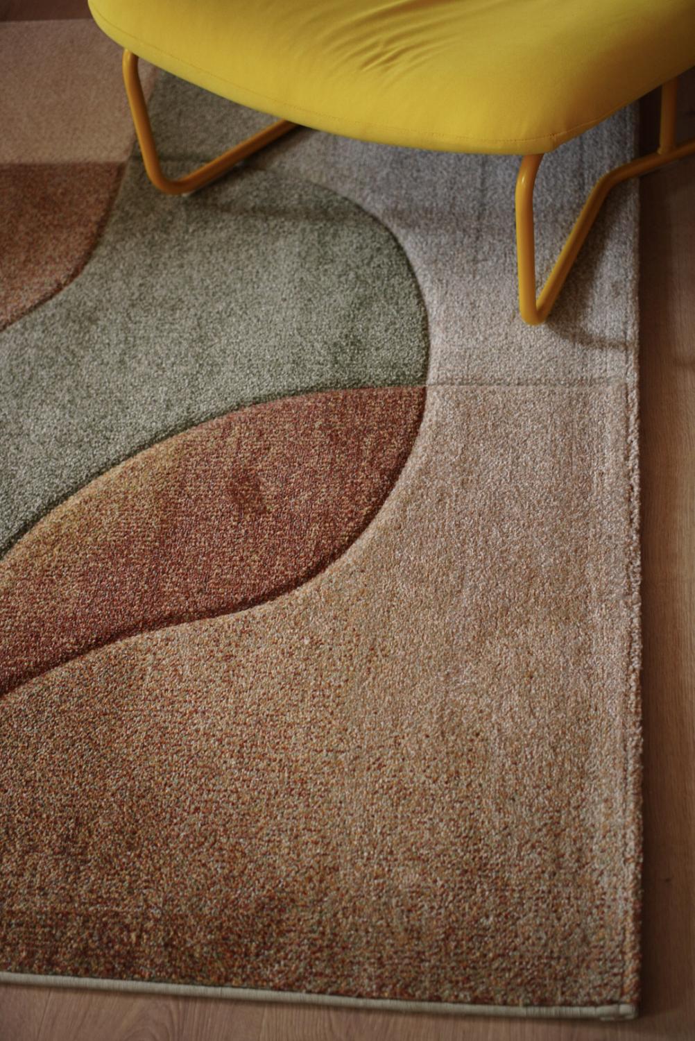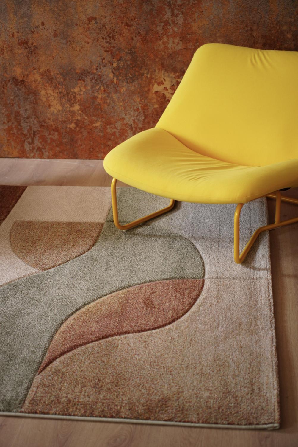 Hayley är en maskinvävd matta med ett mjukt, organiskt mönster inspirerat av böljande former och retro-modern design. Mönstret flyter harmoniskt över ytan och skapar ett lugnt men samtidigt levande uttryck. Färgskalan går i varma och jordnära toner av sand, beige, rost, terrakotta, grått och dämpat grönt – en välbalanserad palett som ger rummet värme och karaktär utan att ta över.