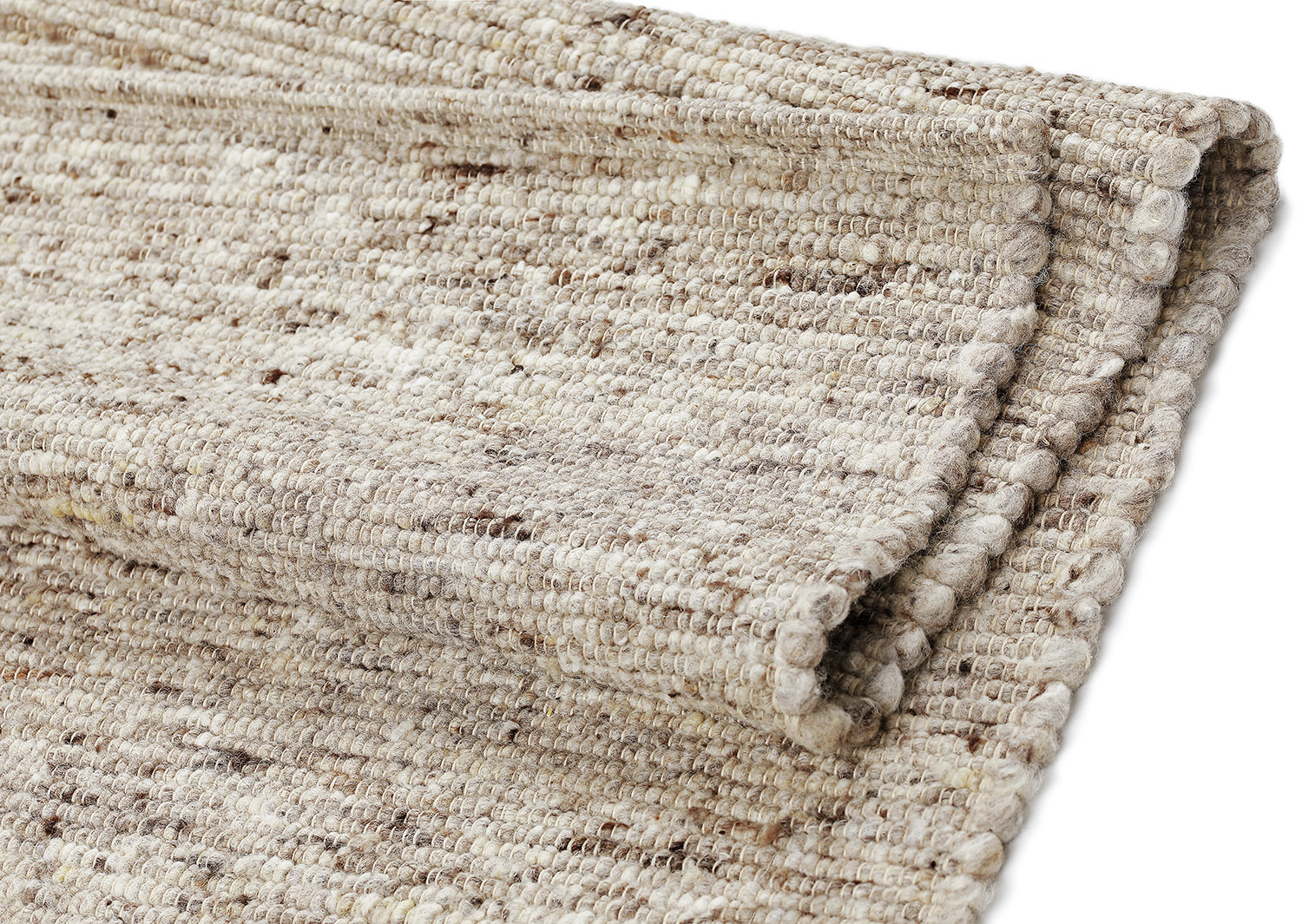 Hygge Beige är handvävd i den finaste, rena nya ullen från Nya Zeeland – helt ofärgad och naturlig. Ullen är slitstark, lätt att hålla ren och kännetecknas av sin mjuka men samtidigt starka struktur. Jämfört med ull som ofta används i kläder är den ännu mer motståndskraftig och har en utmärkt förmåga att återhämta sig, vilket gör mattan mycket långlivad.