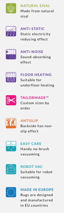 En sisalmatta är vacker och passar lika bra i entrén, loungen, mötesrummet eller i trappen! Att inreda med sisalmattor i uterum har blivit mycket populärt, eftersom det skapar en naturnära och härlig känsla. En av sisalens många fördelar är att det är ett väldigt slitstarkt och rustikt material som gör att mattan passar bra i utrymmen med högt slitage! Sisalmattan är enkel att rengöra; skaka och dammsug den med jämna mellanrum. Rekommenderas både till hem och offentlig miljö.