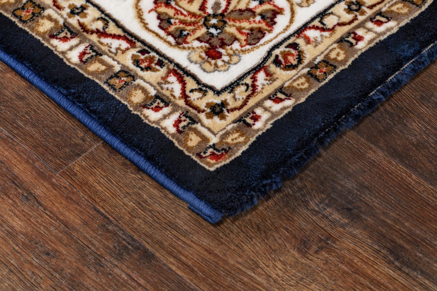 Versailles Blå är en klassisk wiltonmatta med en naturbeige botten. Mattan har ett klassiskt orientaliskt medaljongmönster i creme med inslag av blått, rött och vitt. Runt om går en matchande bord och ett anslutande kant med den vackra naturbeige tonen. Versailles har en fin lyster och finns i flertal storlekar och längder för att lätt kunna passa in såväl som en välkomnande hallmatta eller en vacker matta i vardagsrummet.